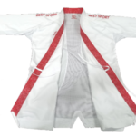 This dress is made from fabric consisting of 185 g/m² fabric made of 100% polyester yarn. 3-thread stitching and an additional column on the collar are used to keep the collar upright. There are binding threads inside the jacket. It has zero shrinkage, and when taken according to the athlete’s height, it can be used without any other intervention. 5 cm elastic band and thread are used on the trousers. There is Kihon sports logo embroidery on the right chest of the dress. The product is sold with a white belt.