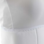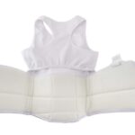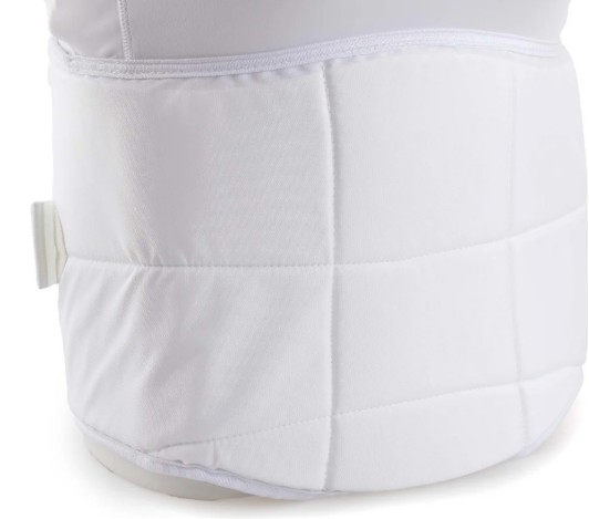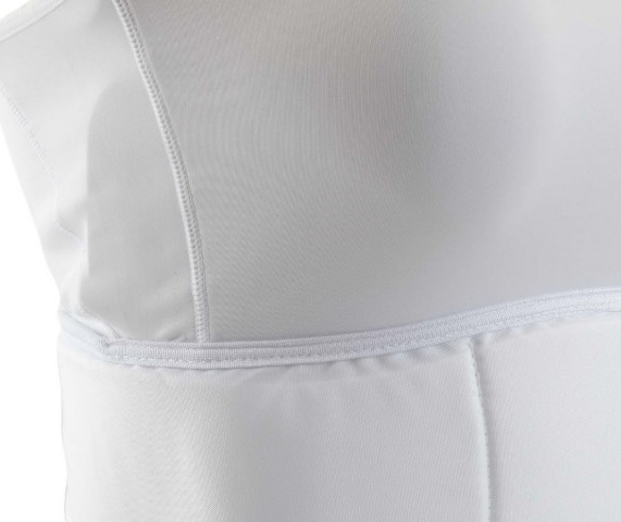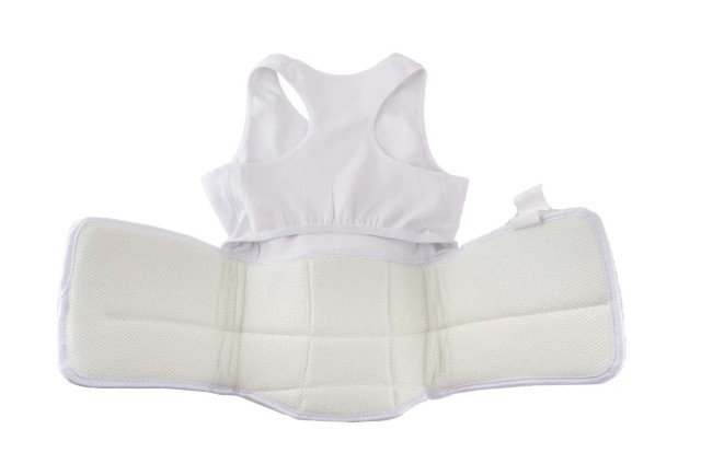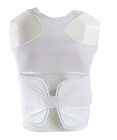 The protective guard sits just below the bust line, with a lycra chest piece above. This design allows a breast guard plate or the WKF Approved Female Breast Guard to be worn underneath the lycra chest. Many athletes find this configuration more comfortable than a single full chest body protector.